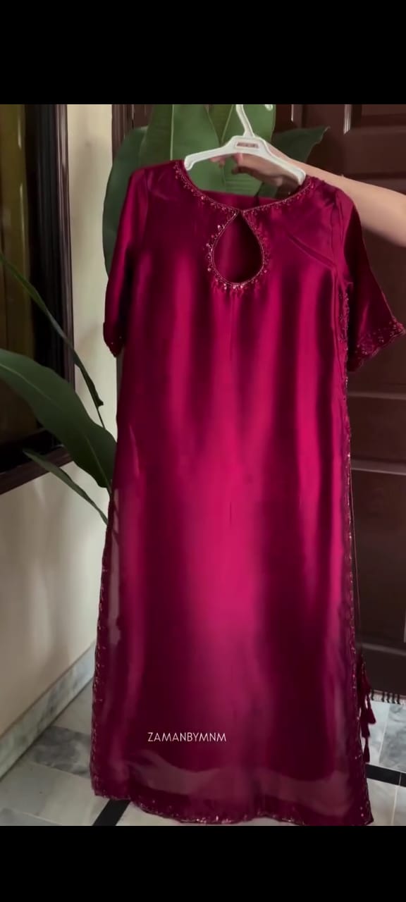 Elevate your festive charm with this graceful Tussel Silk Short Shirt Set, delicately adorned with intricate handwork on the neckline and daman, enhanced by subtle chhan details. Paired with matching Tussel Silk plazo pants and a flowing chhan chiffon dupatta, Marine is a perfect choice for festive evenings and elegant daytime gatherings, where comfort meets refined style.