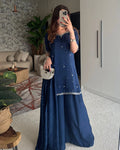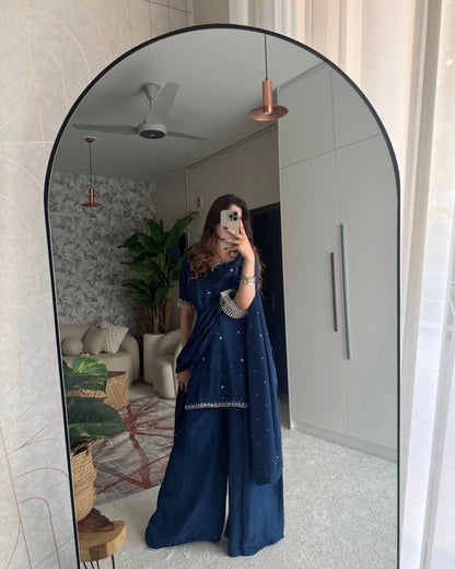 Elevate your festive charm with this graceful Tussel Silk Short Shirt Set, delicately adorned with intricate handwork on the neckline and daman, enhanced by subtle chhan details. Paired with matching Tussel Silk plazo pants and a flowing chhan chiffon dupatta, Marine is a perfect choice for festive evenings and elegant daytime gatherings, where comfort meets refined style.