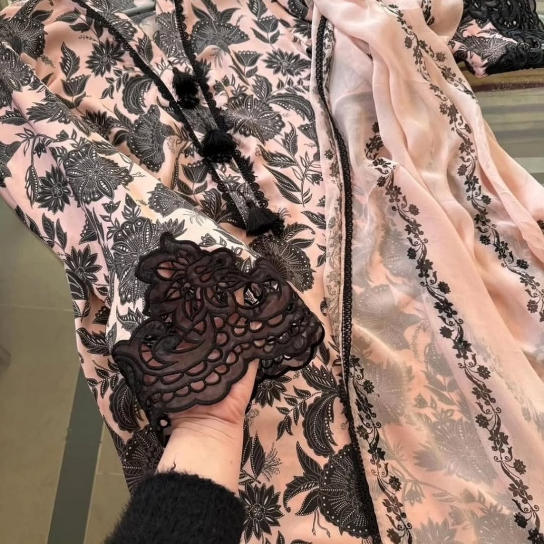 This three-piece stitched Lawn dress features intricate details such as cutwork embroidered sleeves, lace, and tassels on the neckline. The box-style digital printing on the trousers adds a modern touch, while the chiffon dupatta boasts digital prints and shuttle-less lace work on all four sides. Perfect for a stylish and elegant look.