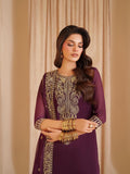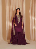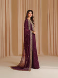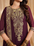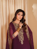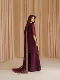 his stunning outfit brings together layers of texture and tone in deep plum. Embroidered chiffon graces the front and sleeves with intricate artistry, complemented by a subtly dyed back. A soft, flowing dupatta adds romance to the silhouette, while embroidered raw silk trousers provide a touch of regal opulence — a look meant to turn heads.